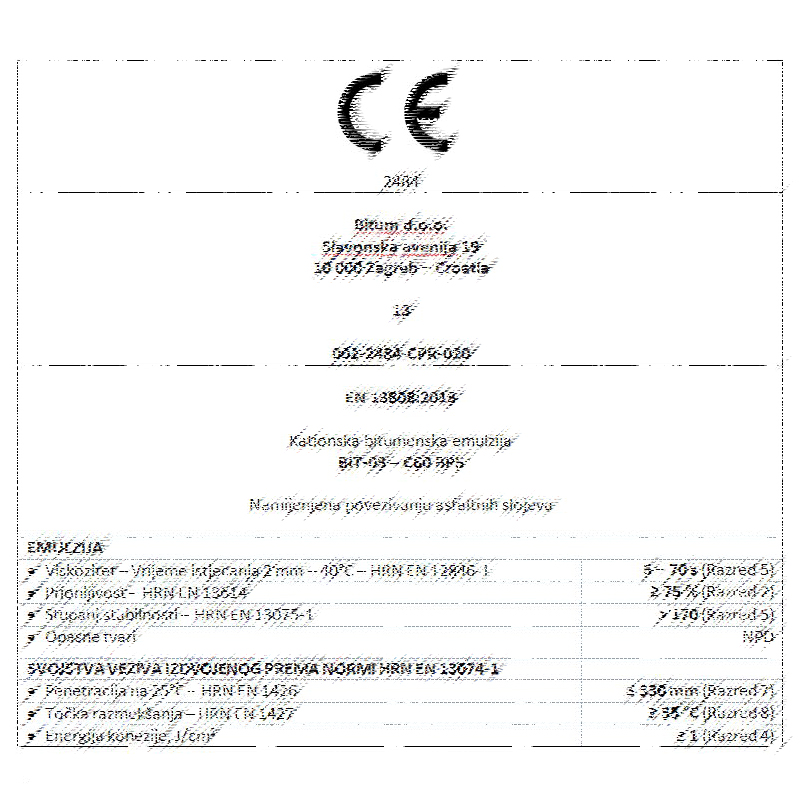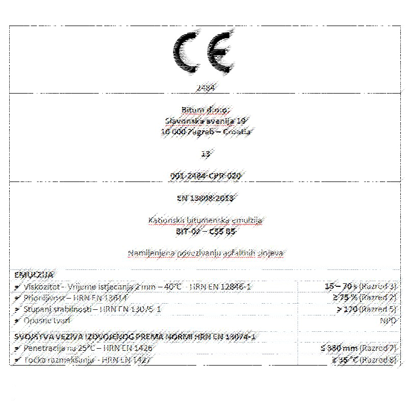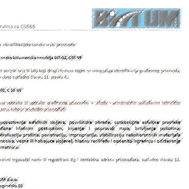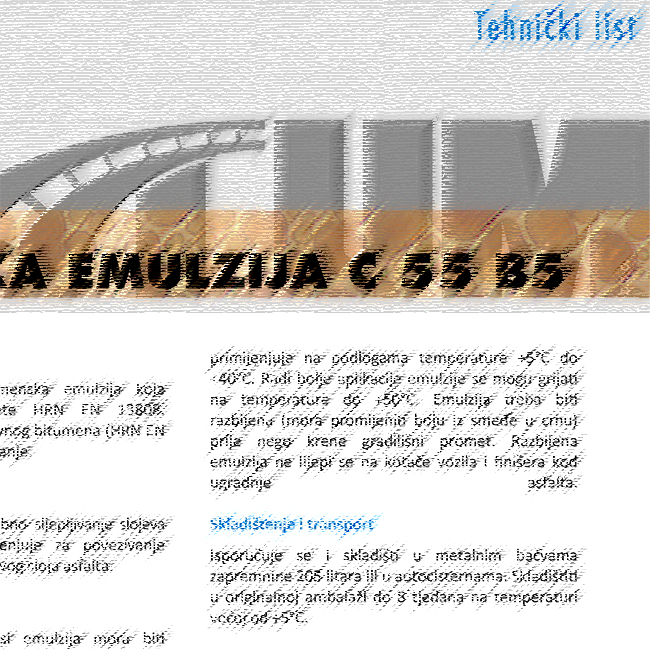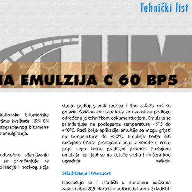 Bitumenske emulzije namijenjene za cestogradnju, proizvedene iz cestograđevnog bitumena koji zadovoljava normu HRN EN 12591 pogodnog za emulgiranje. Emulzije se proizvode na najmodernijem šaržnom postrojenju kapaciteta 12 t/h, izgrađenom na vlastitom dugogodišnjem znanju i iskustvu.