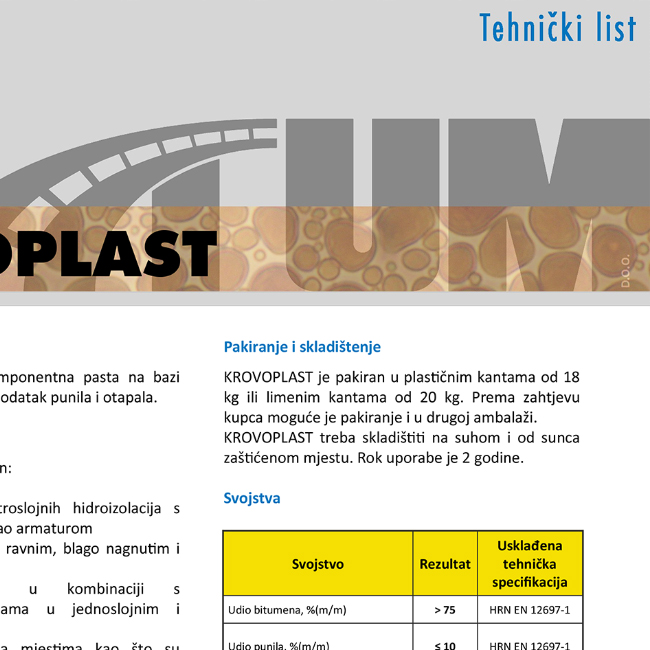 Jednokomponentna pasta na bazi polimernog cestograđevnog bitumena uz dodatak punila i otapala. Namijenjena je izradi hidroizolacijskih sustava.